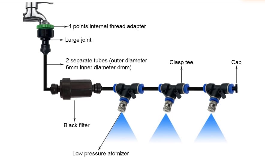 • Attach the hose adapter to your water source (garden hose or outdoor faucet). If using a hose splitter, connect it to the faucet, then attach the hose adapter to one of the splitter outlets. Install a water filter and pressure regulator between the water source and the misting system if desired, to ensure clean water and consistent pressure.